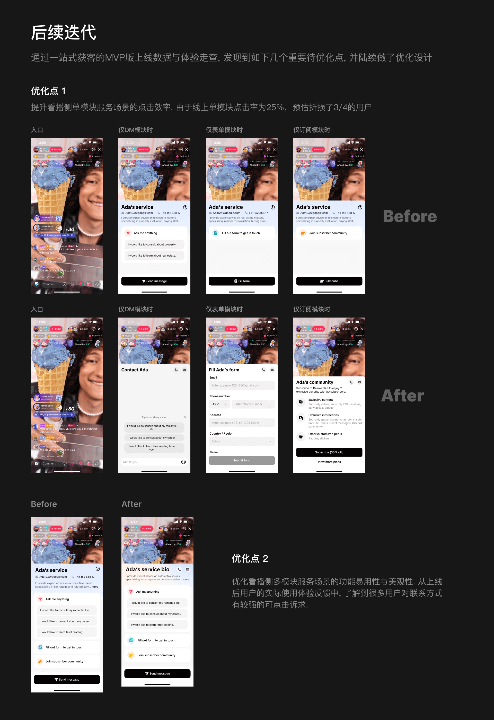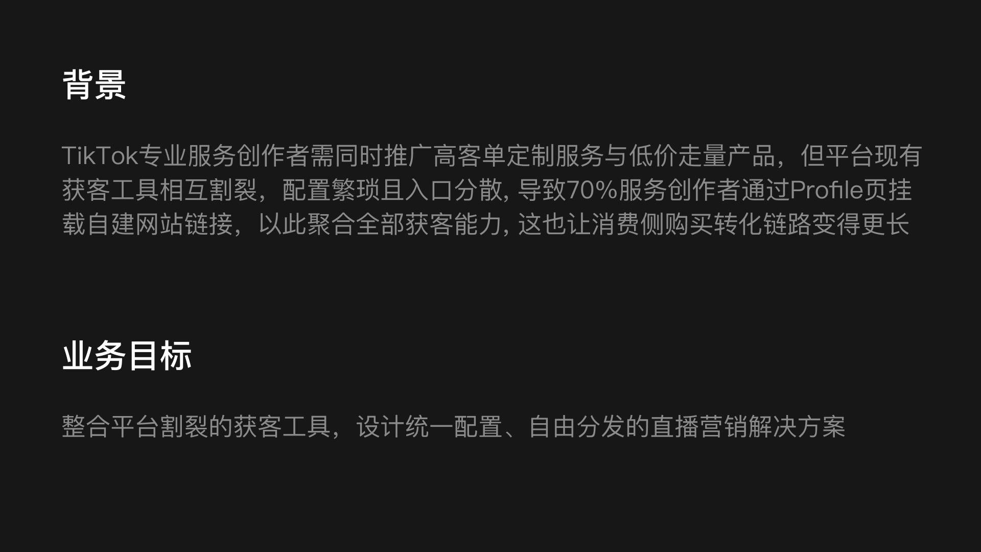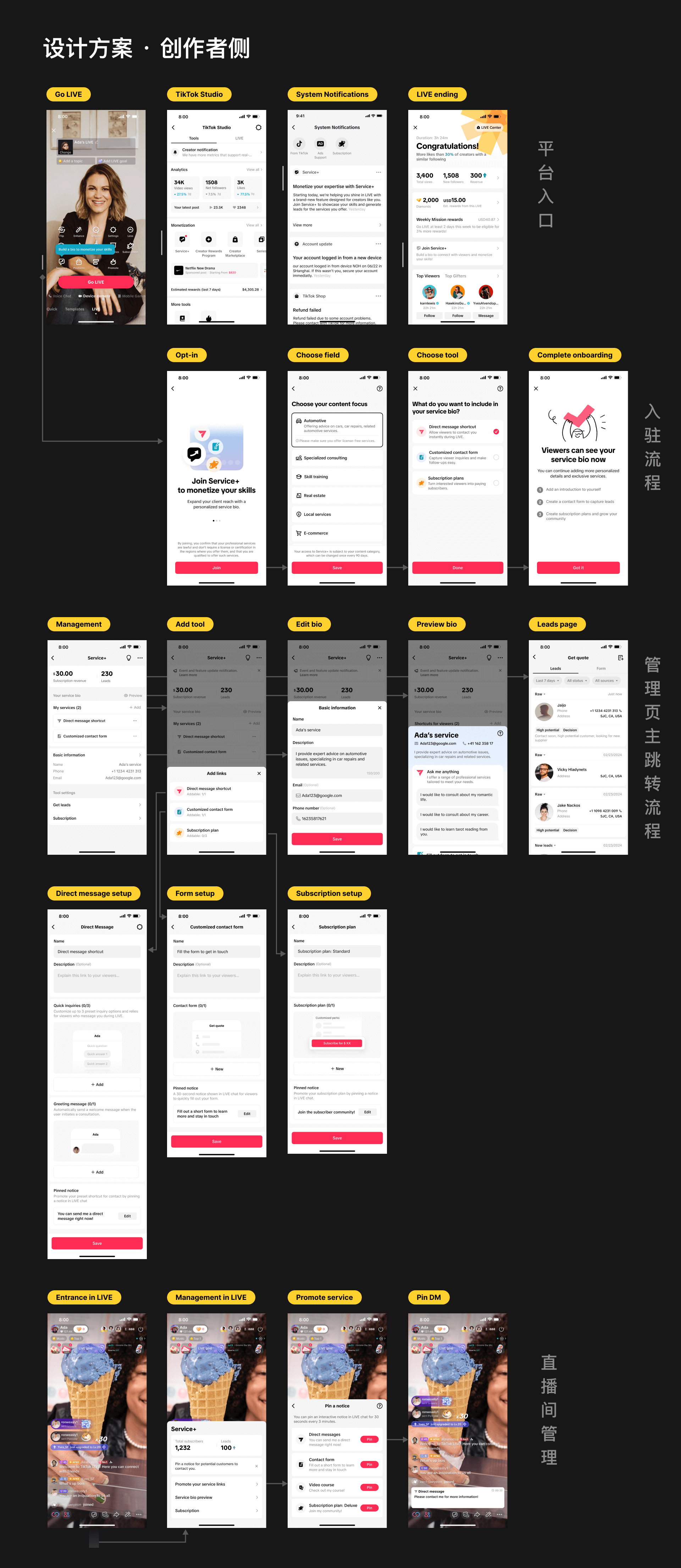 本项目为TikTok专业服务创作者打造了整合式直播获客解决方案,通过统一平台原本割裂的Leads Generation、Subscription等工具,构建了支持高/低客单价服务自由配置的营销系统. 全新的交互设计, 带来核心指标增长2.4%