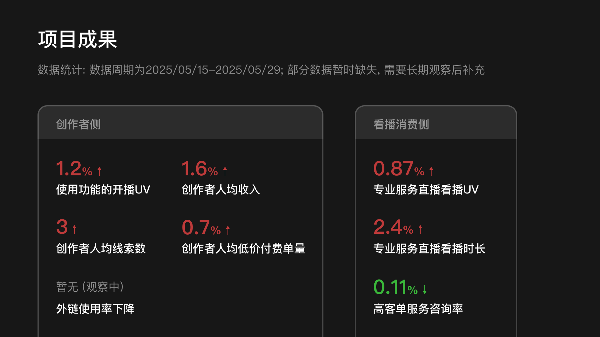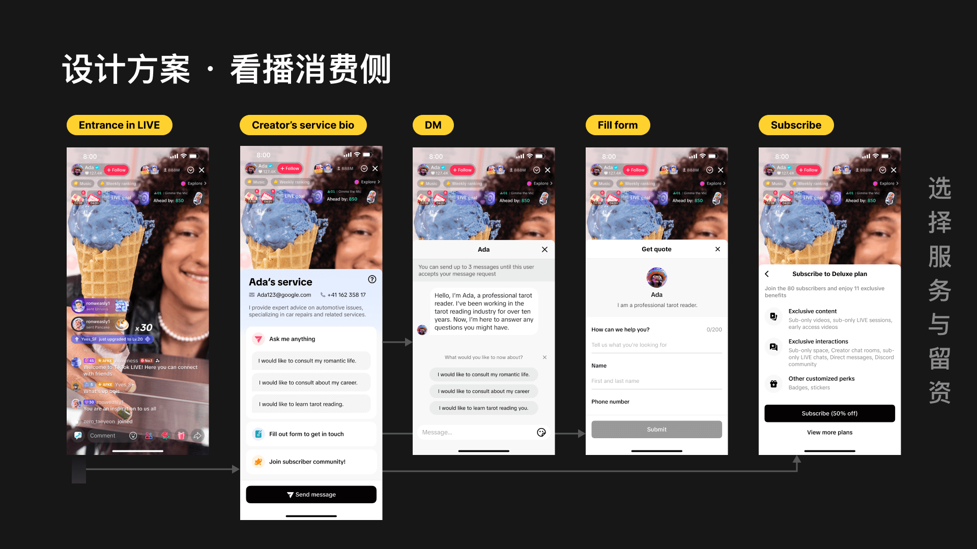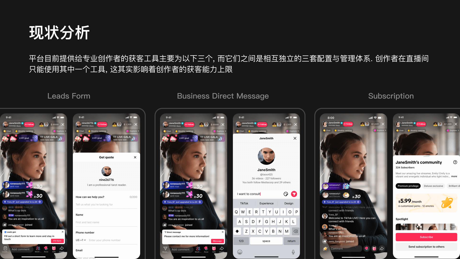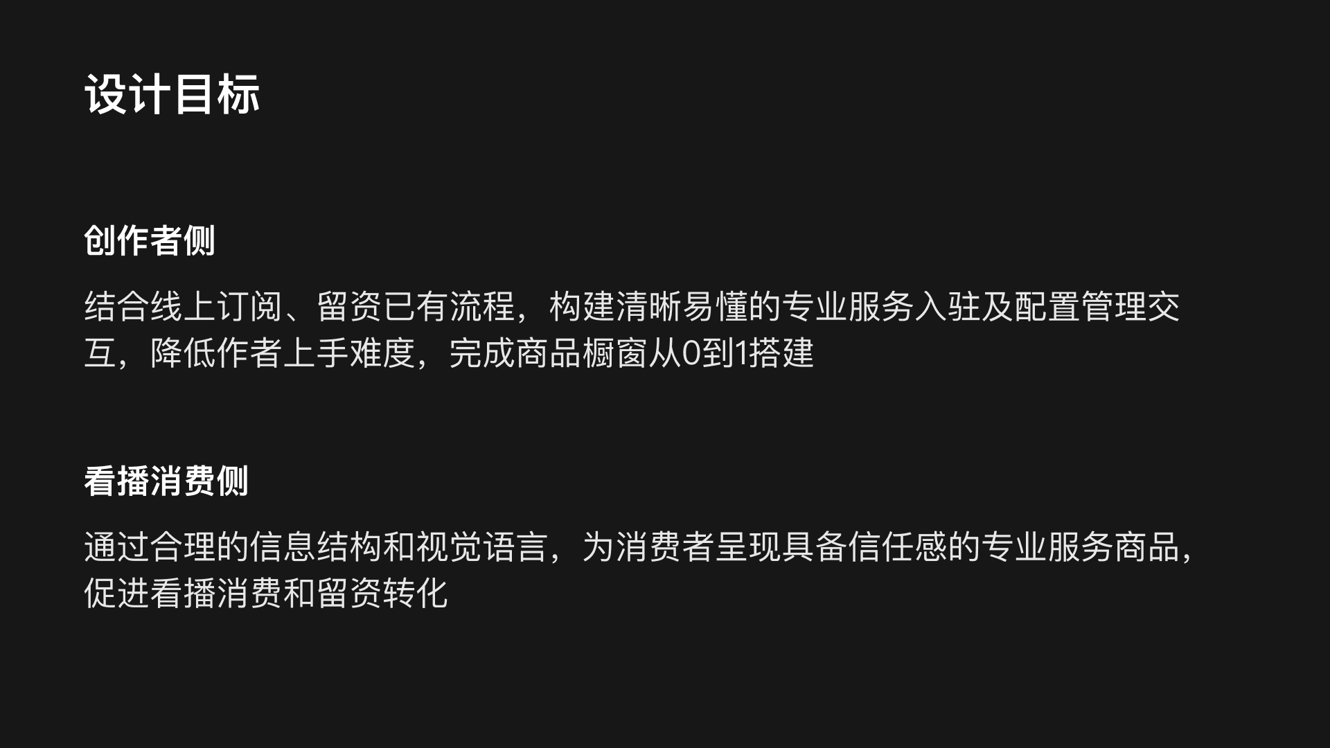 本项目为TikTok专业服务创作者打造了整合式直播获客解决方案,通过统一平台原本割裂的Leads Generation、Subscription等工具,构建了支持高/低客单价服务自由配置的营销系统. 全新的交互设计, 带来核心指标增长2.4%
