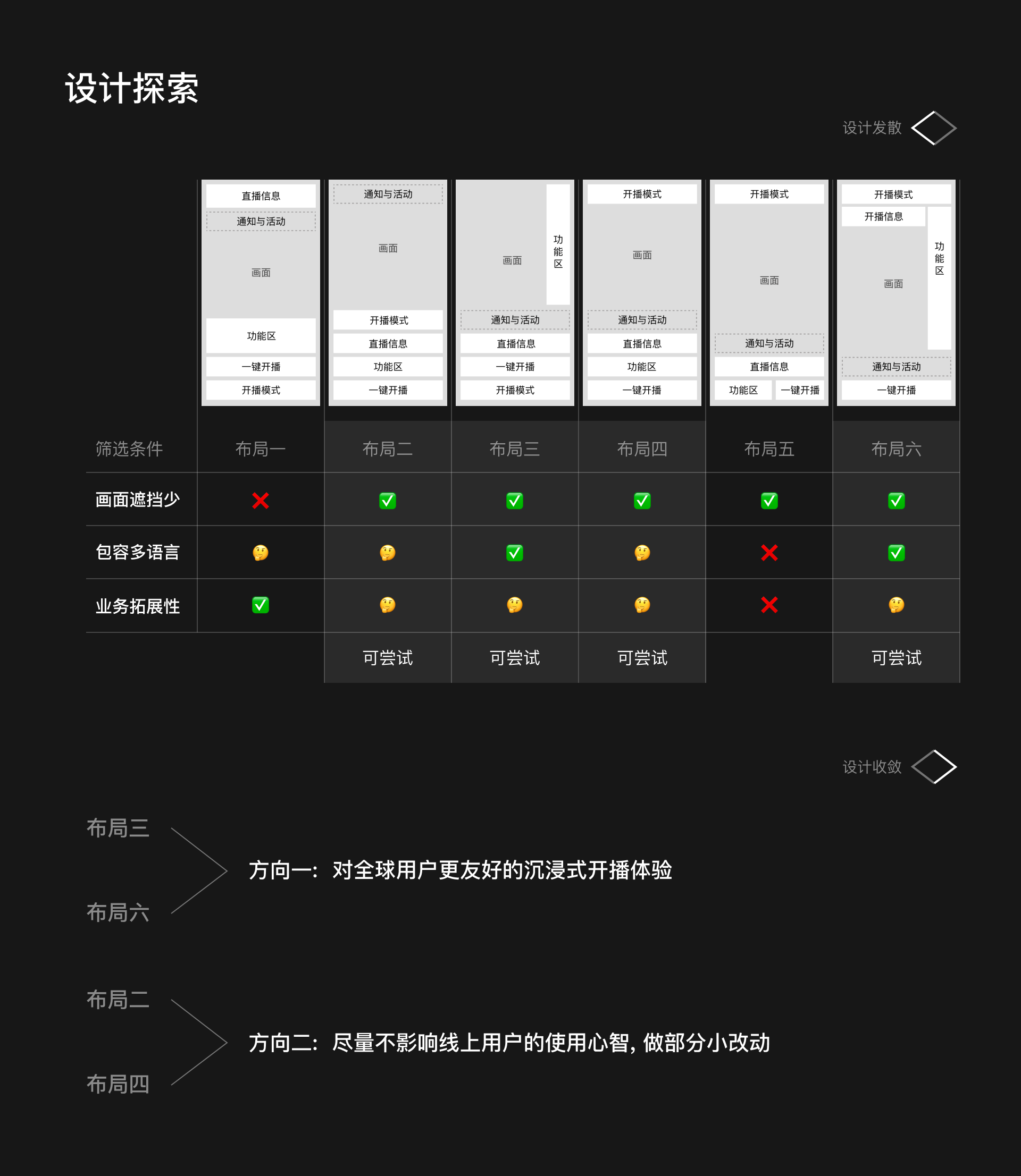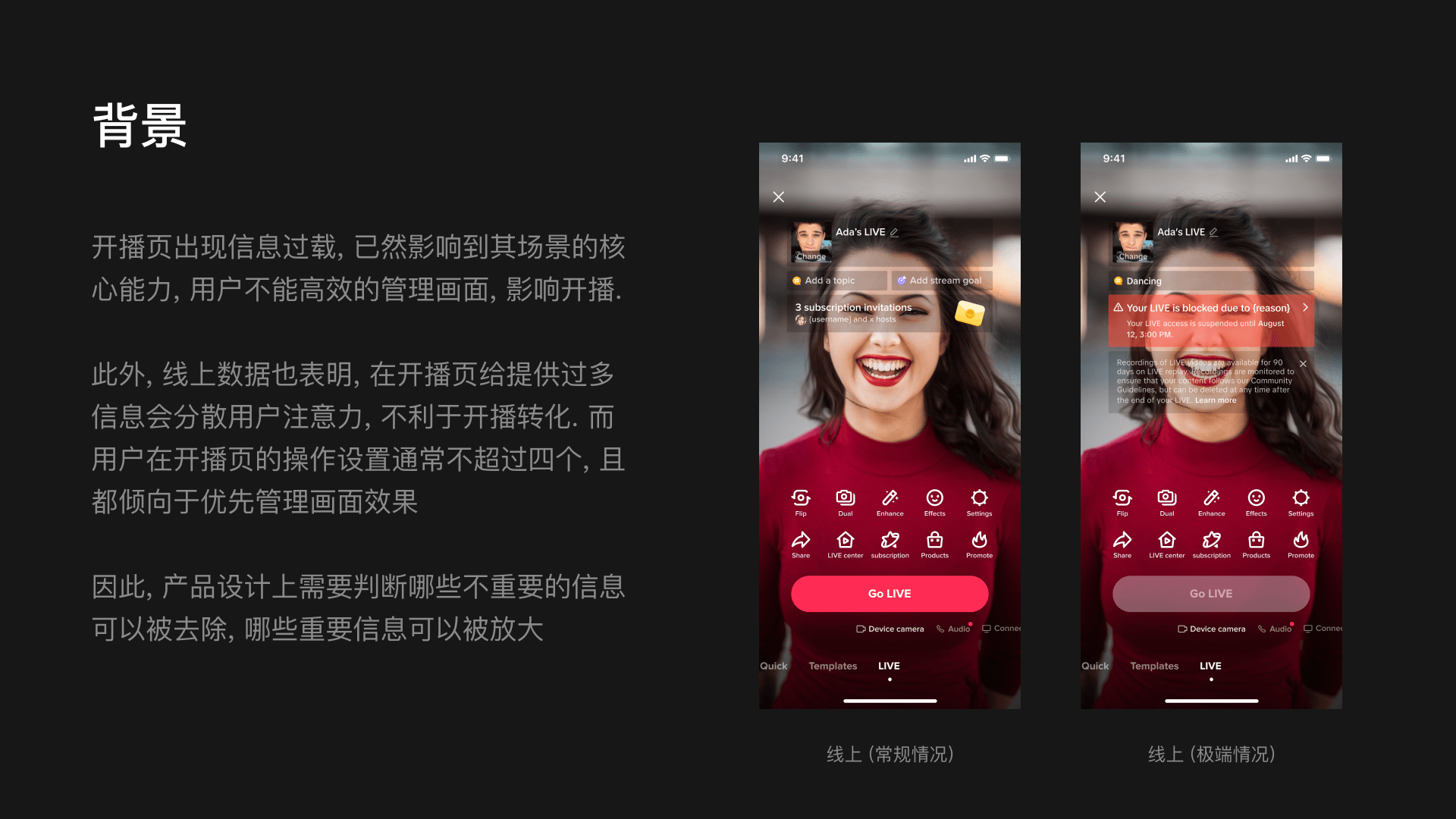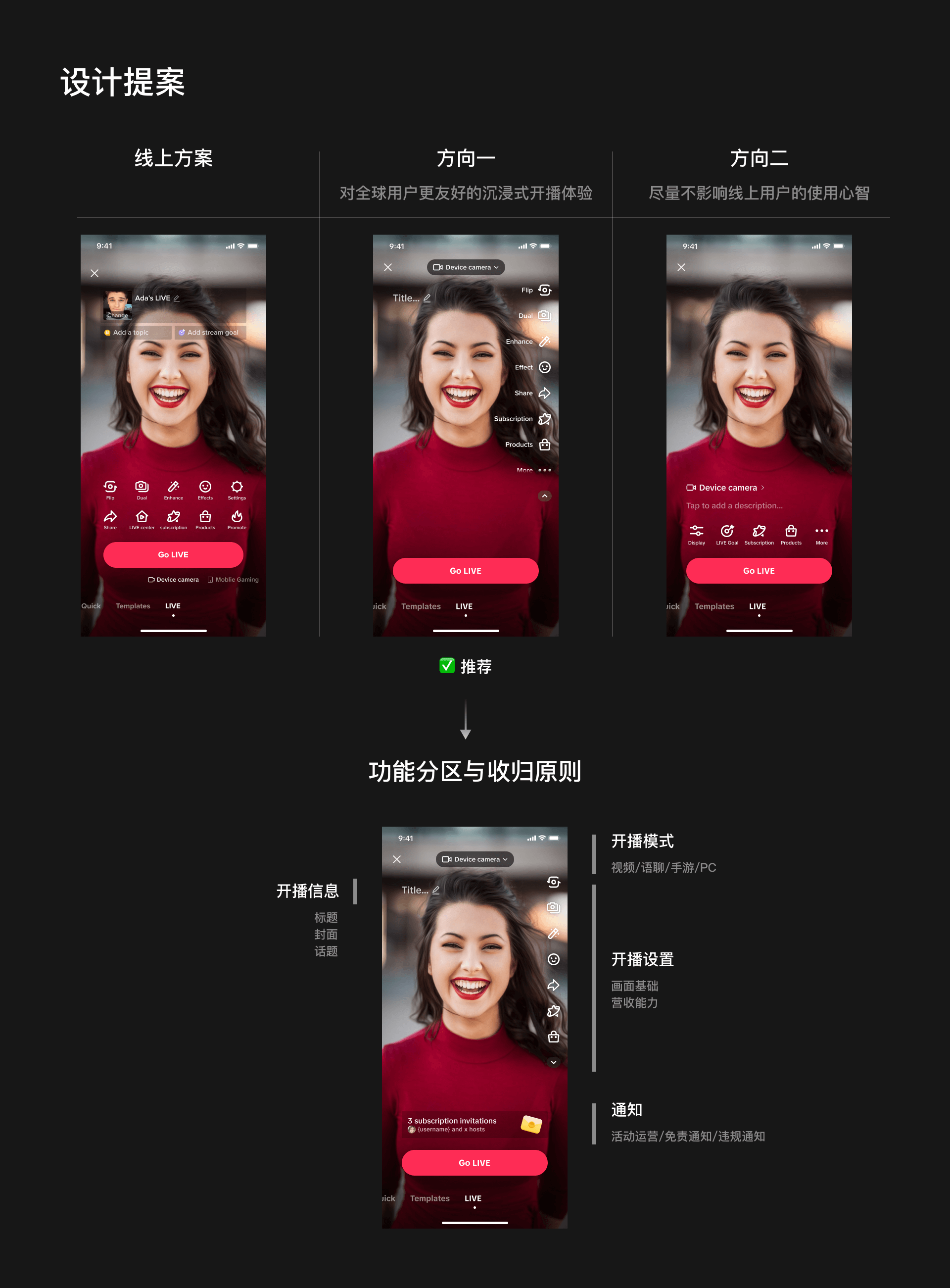 本项目对TikTok LIVE 开播页进行了设计改版. 作为设计师, 前置探索如何解决开播界面信息负载与操作复杂的问题, 同时探究如何让产品体验更国际化, 更包容全球多语言. 经A/B实验后, 上线方案带来主播开播pv提升3.5%, DAU均开播时长提升0.5%