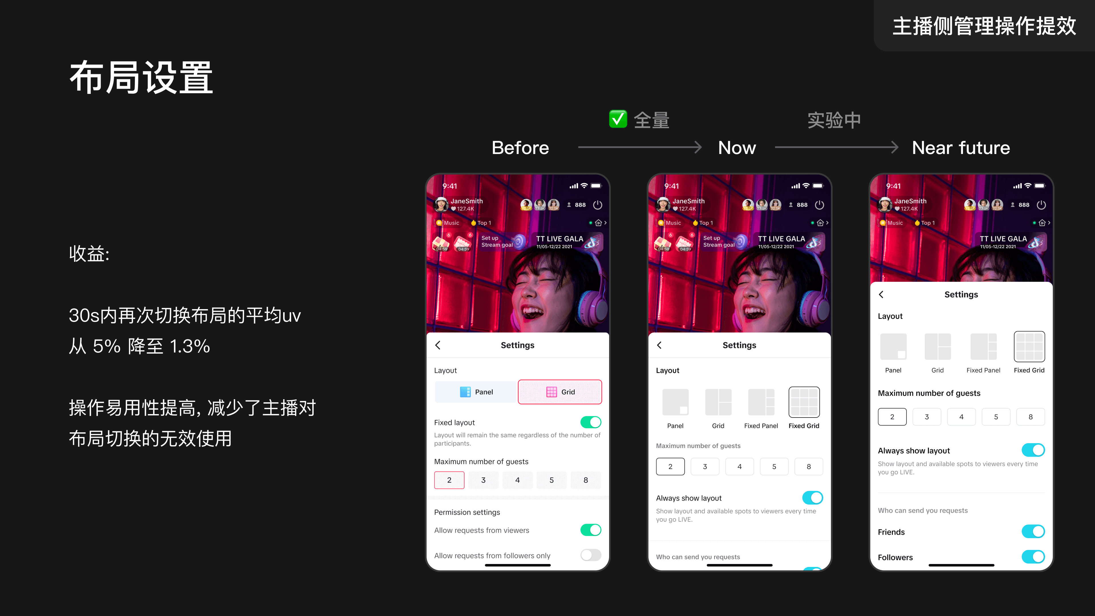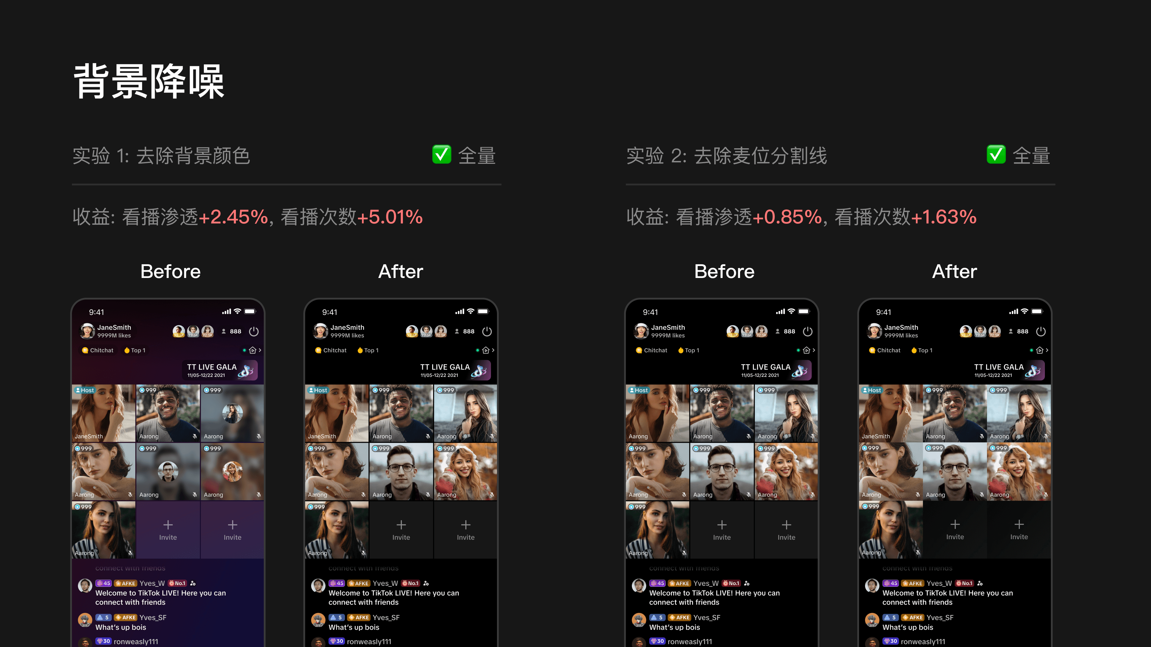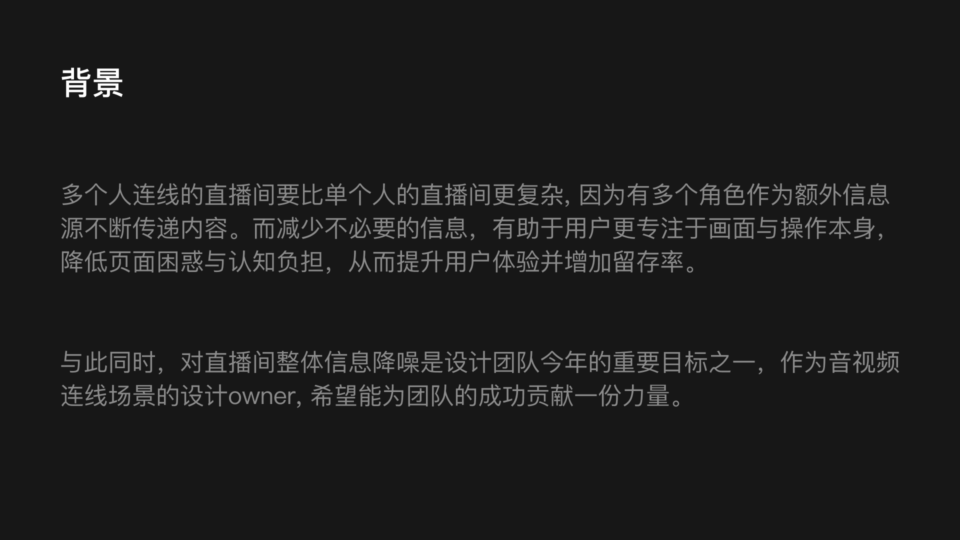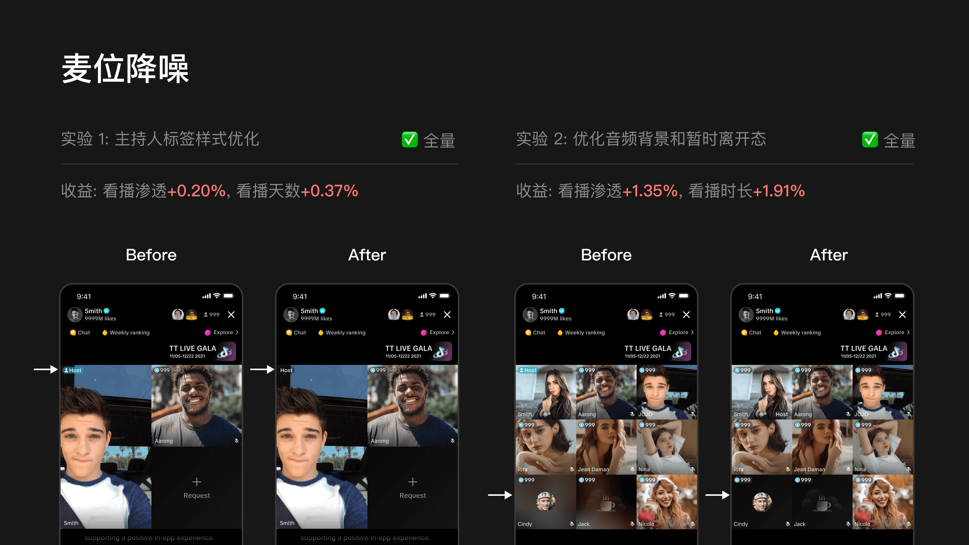 本项目对TikTok LIVE 音视频连线场景进行了专项体验优化. 作为业务设计owner, 主动发起体验问题治理, 与业务和开发沟通获得资源, 推动优化方案上线, 并取得数据收益