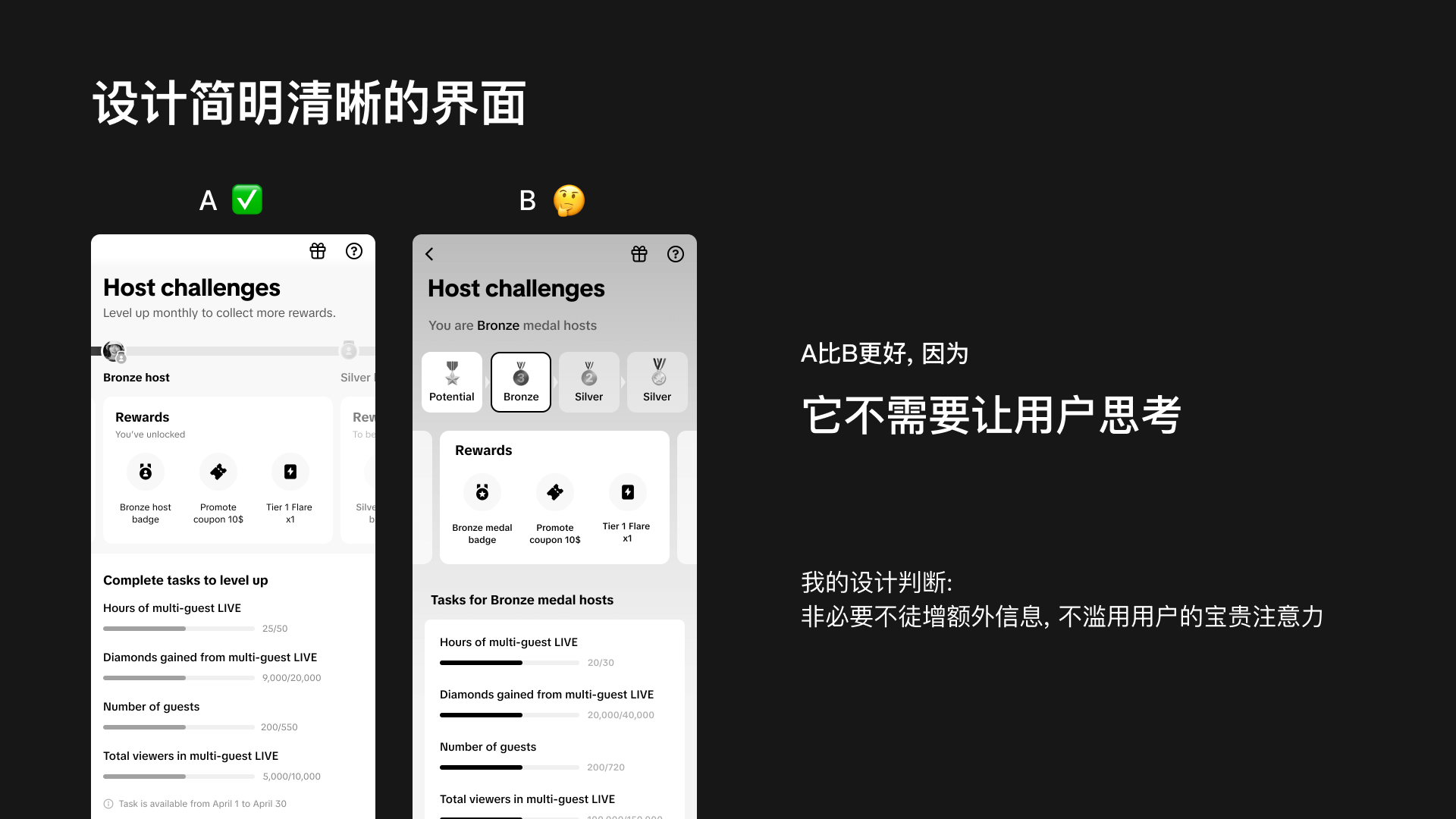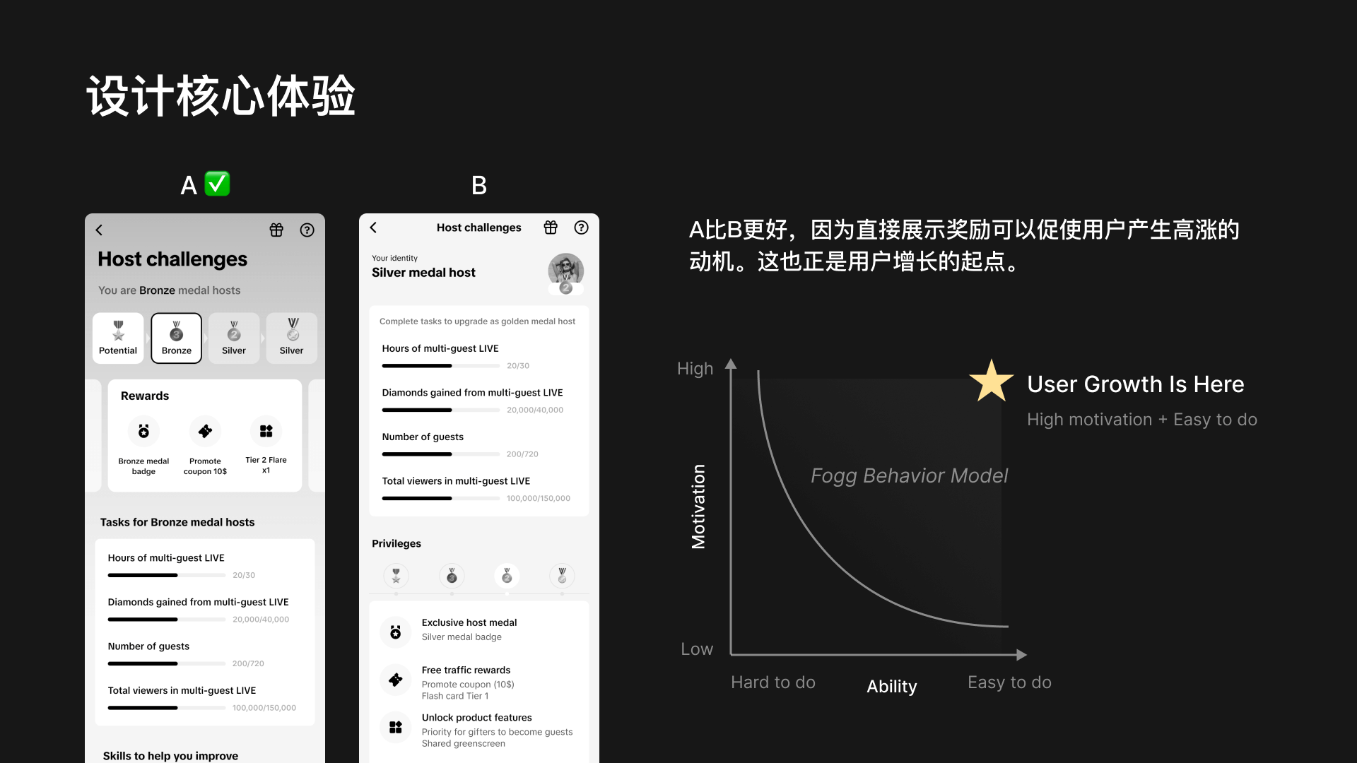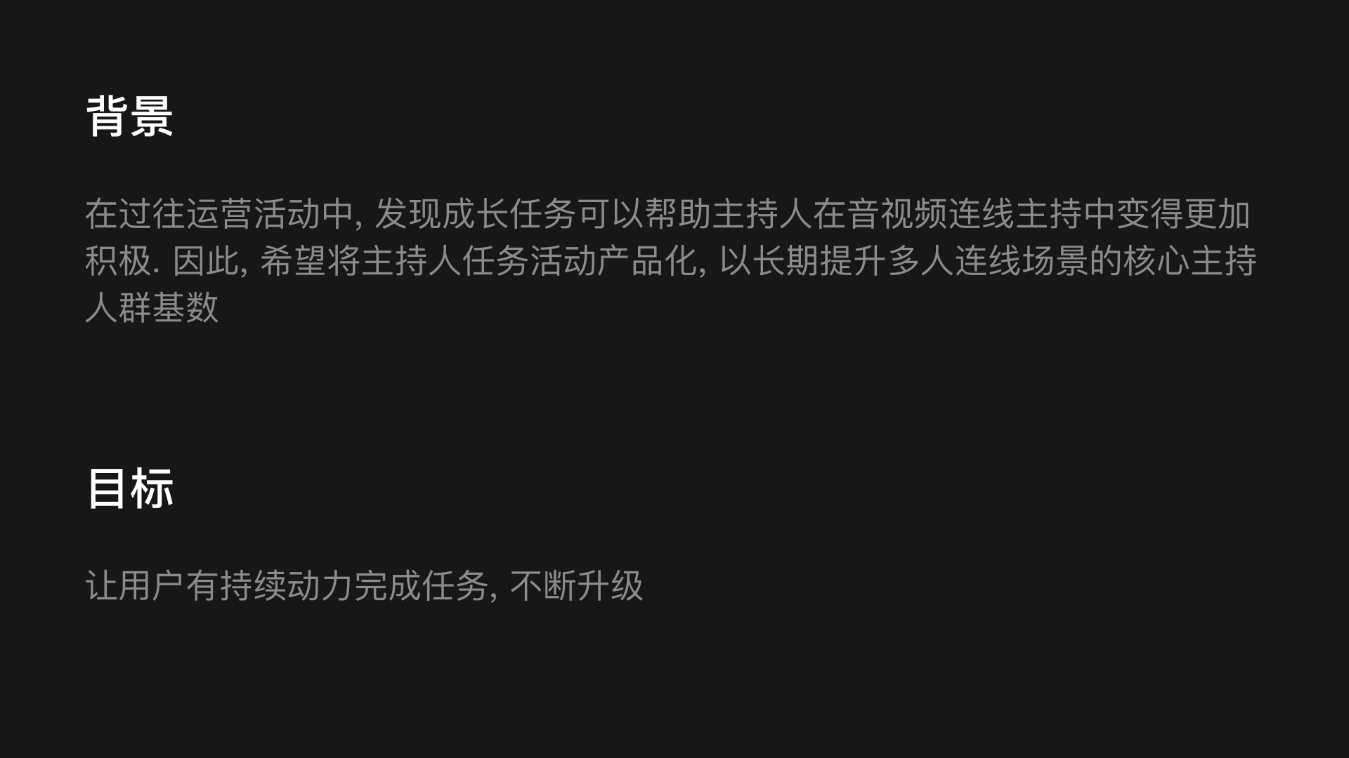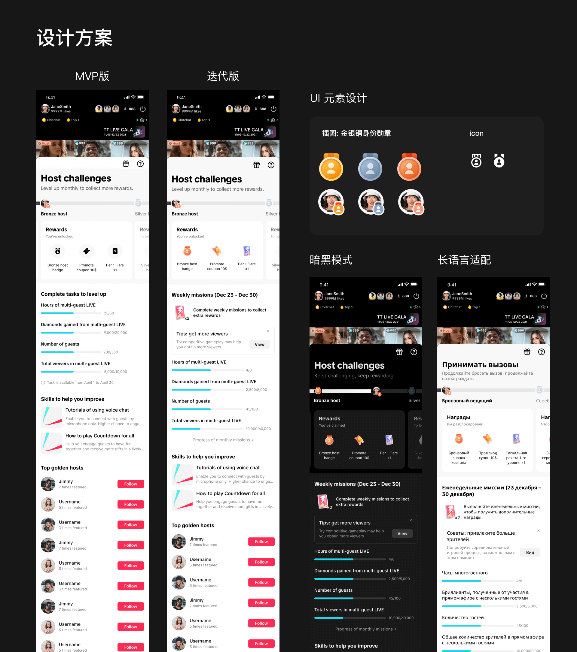 本项目是为使用TikTok LIVE 音视频连线的主播人群(即主持人)做用户增长. 项目的设计突破点是理解用户增长策略与产品逻辑, 并经过设计师消化后转述为可被用户直观感知的信息, 通过设计手段能做到持续激励用户升级